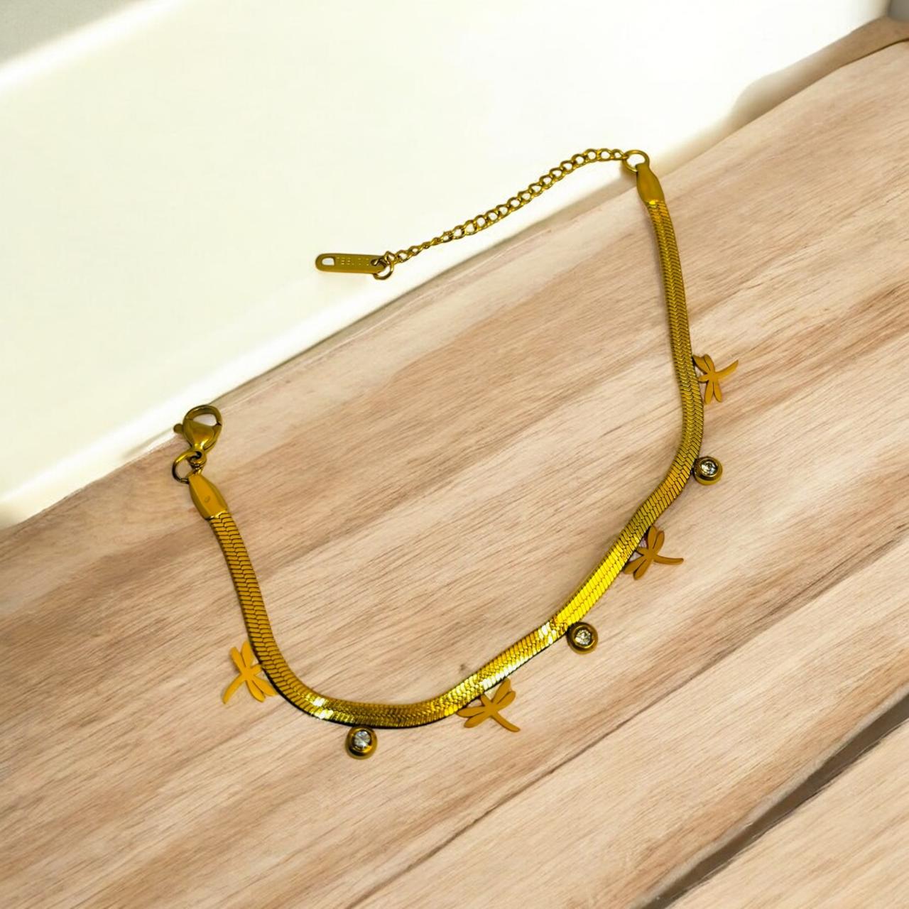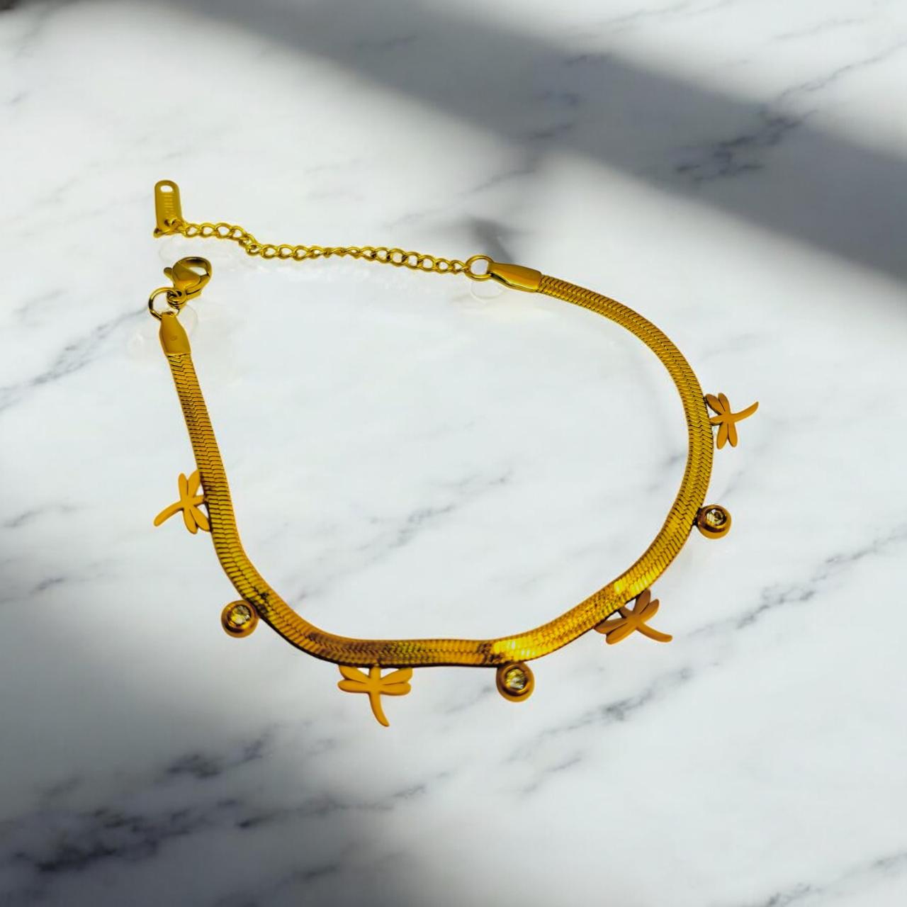 This sleek snake chain bracelet features dragonfly-inspired charms and delicate crystal studs. Lightweight, elegant, and dreamy — it's your everyday escape to golden hour.