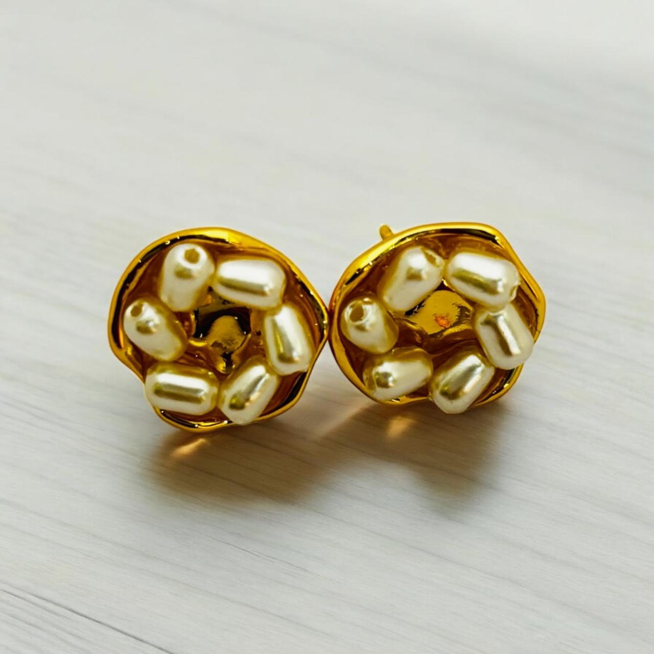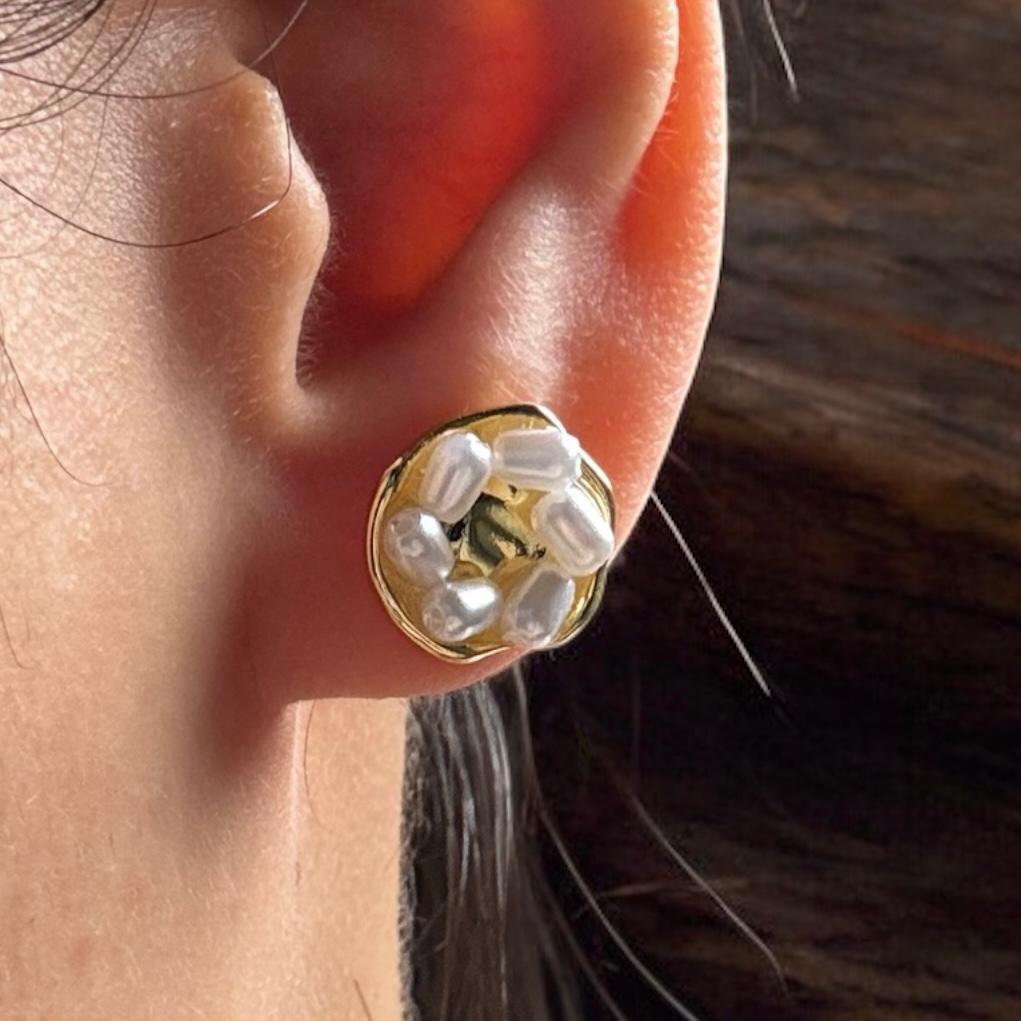 A modern twist on elegance- Our Pearl Nest Studs featured a hammered gold disc wrapped with irregular mini pearls that seem to float like treasures in a golden nest.