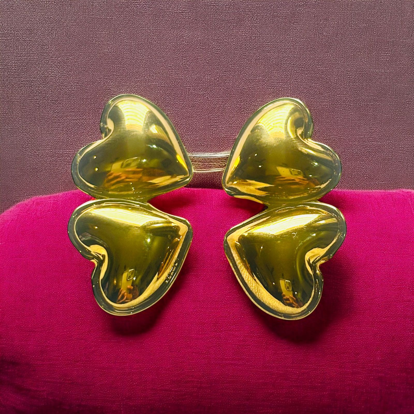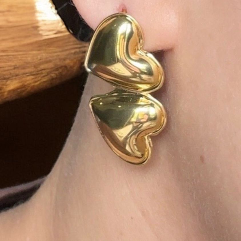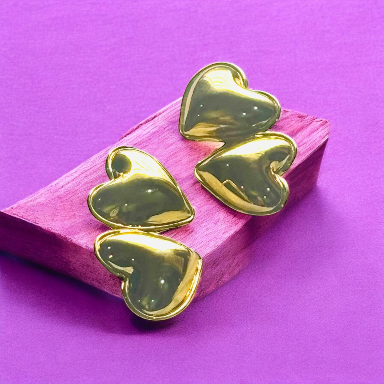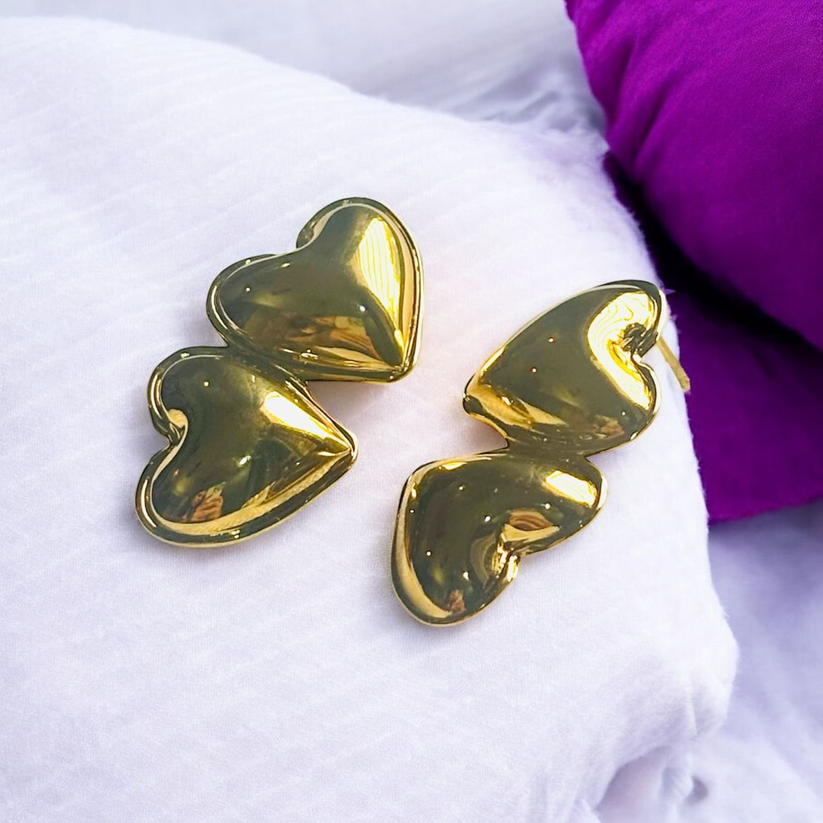 Double the hearts, double the charm. The Double Love Studs feature two glossy, puffed golden hearts stacked vertically for a playful yet elegant statement. Their bold yet soft design adds a dash of romance and confidence to your everyday or party look. Crafted to be anti-tarnish and hypoallergenic, these studs are as comfortable as they are captivating.