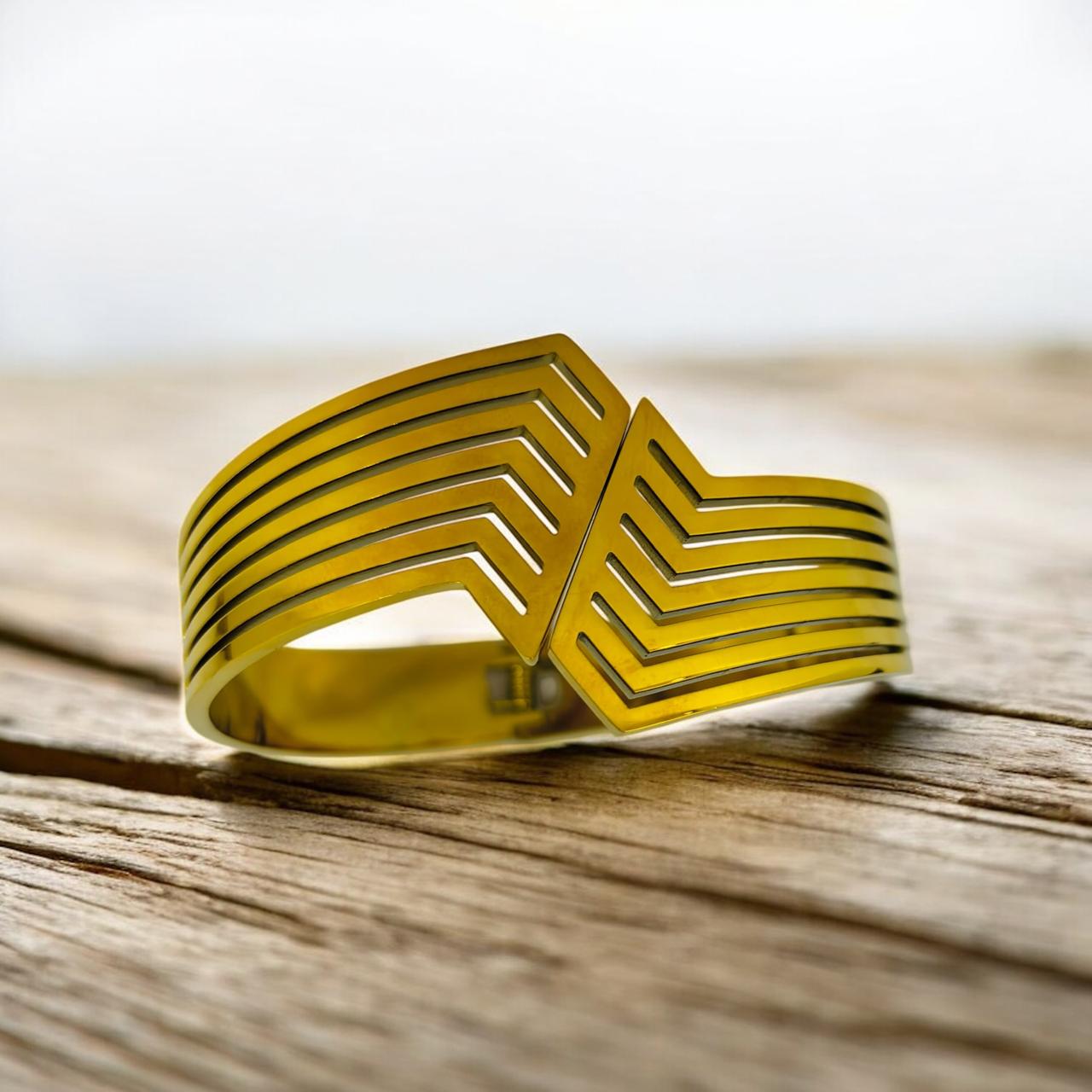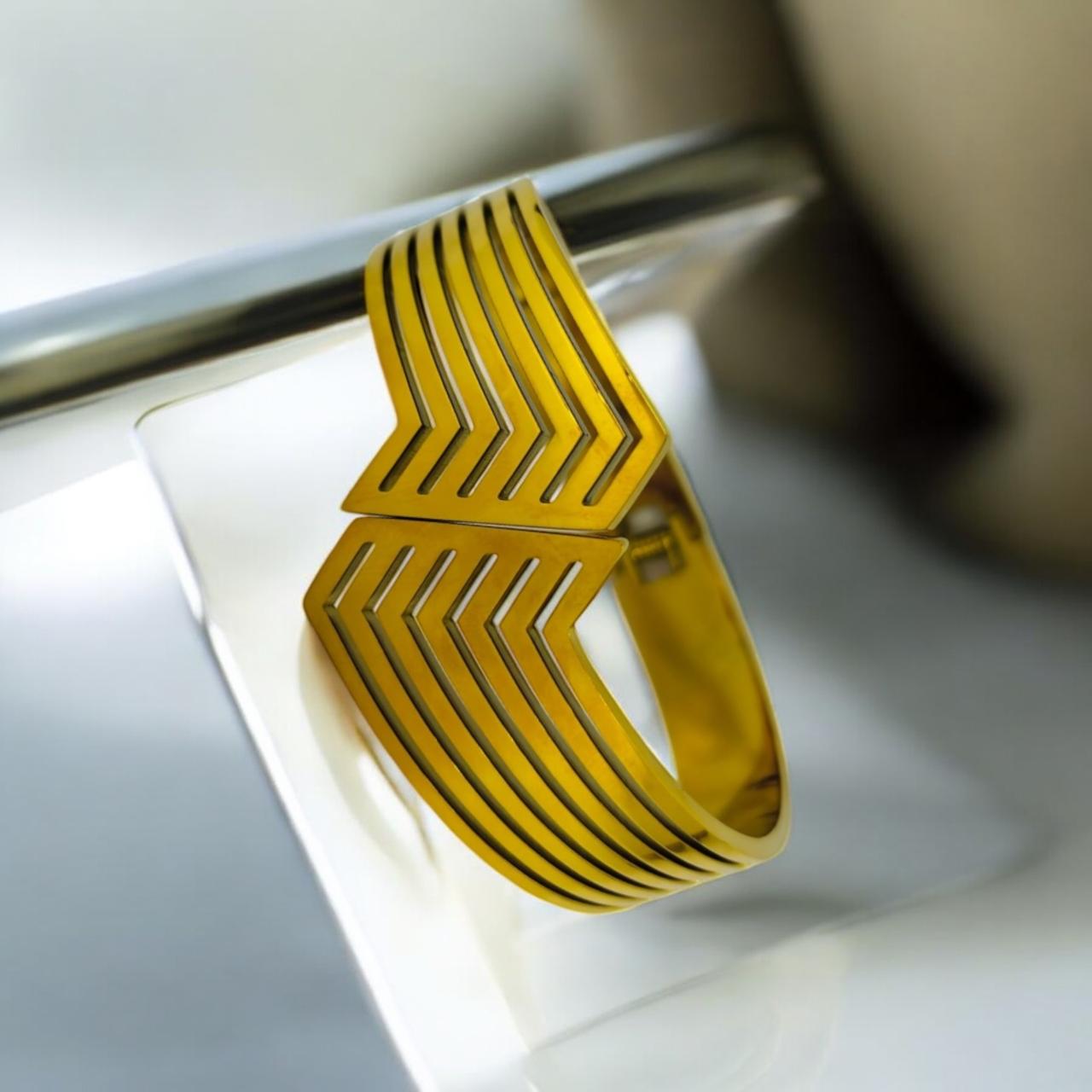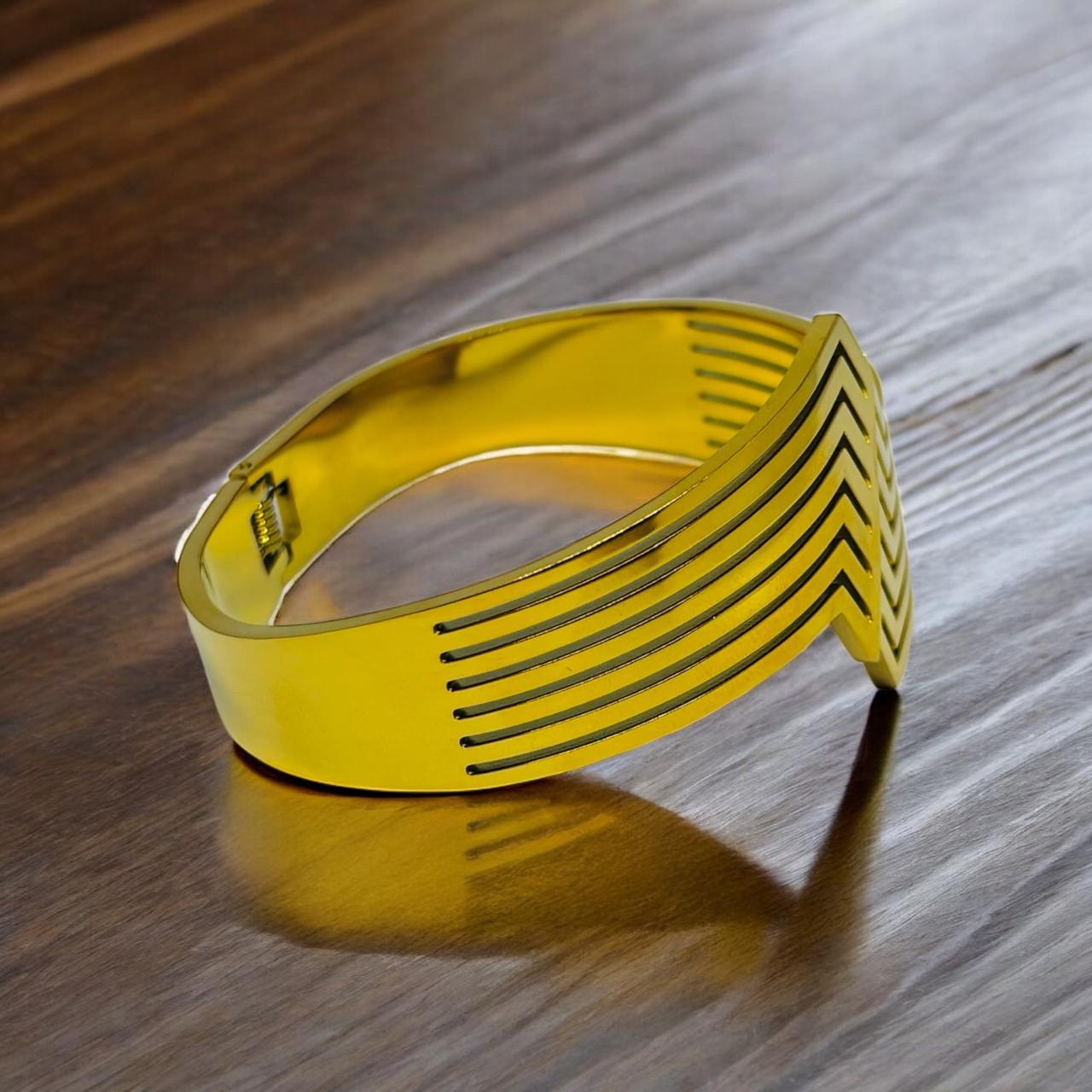 Bold yet elegant, this Chevron Cutout Kada adds effortless charm to your everyday look. With its symmetrical V-cut design and minimal shine, it's a piece that blends tradition with a modern edge. The front-open design ensures comfort and ease, while its sleek finish makes it a versatile pick for both workwear and occasion outfits. Style it solo or stack it — this bracelet speaks sophistication either way.