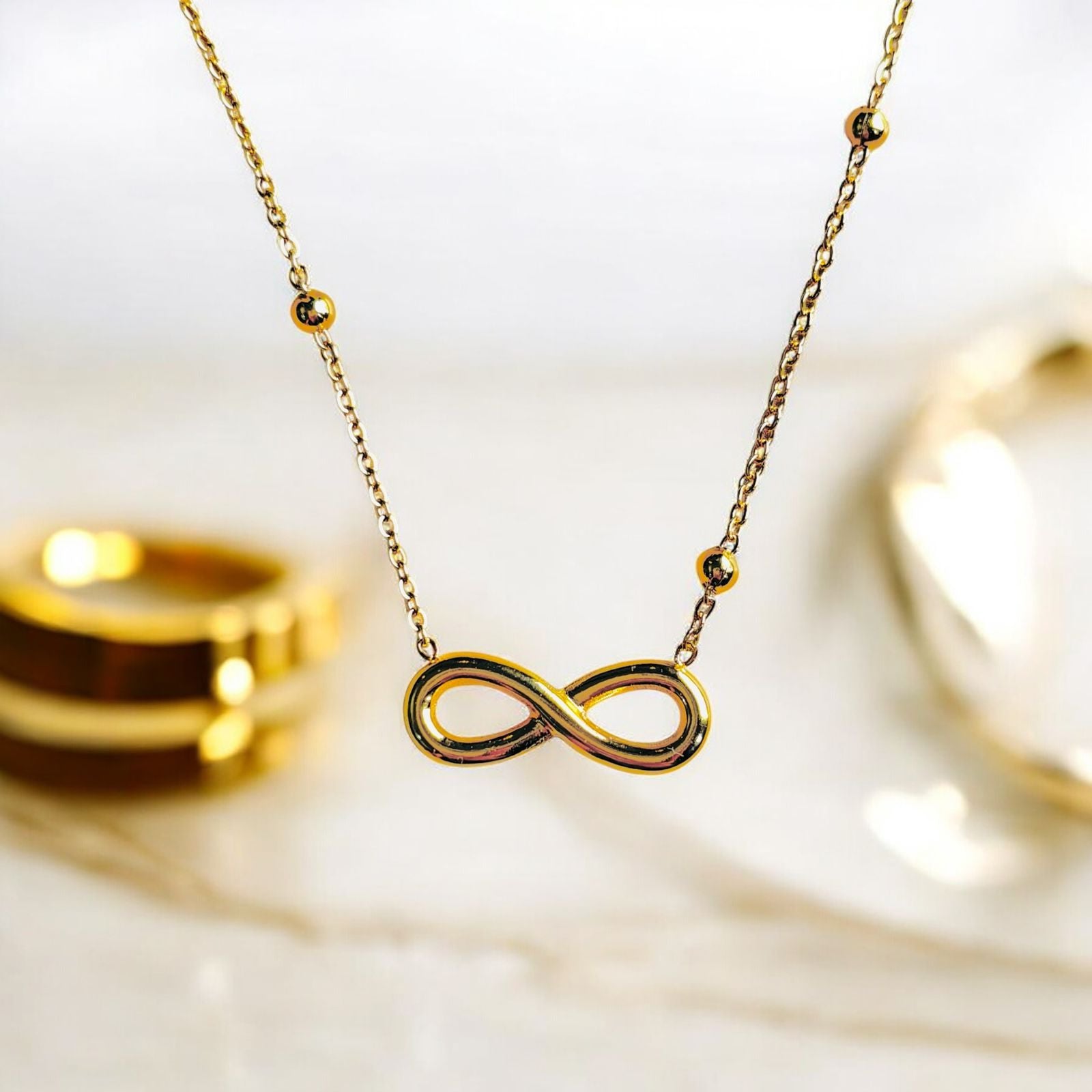 A symbol of timeless love and endless shine. This necklace features interlinked loops in a high-polish gold finish that never dulls. A classic with a modern twist.