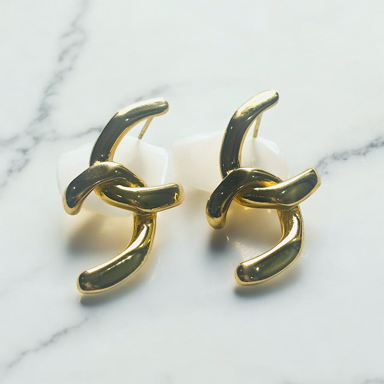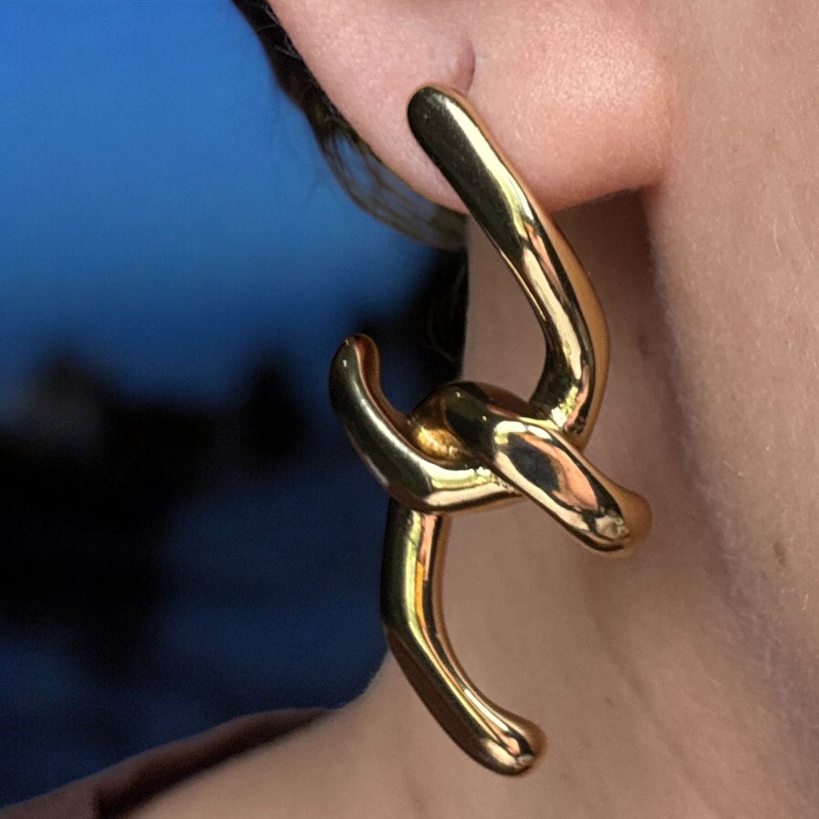 Bold. Fluid. Unapologetically modern. The Sculpted Knot Hoops feature an abstract, interlinked design that mimics the movement of molten gold in a sculptural form. With their high-shine finish and unique silhouette, these earrings blur the line between art and accessory. Crafted to be anti-tarnish and hypoallergenic, they’re made for the trendsetters who love making a statement without saying a word.