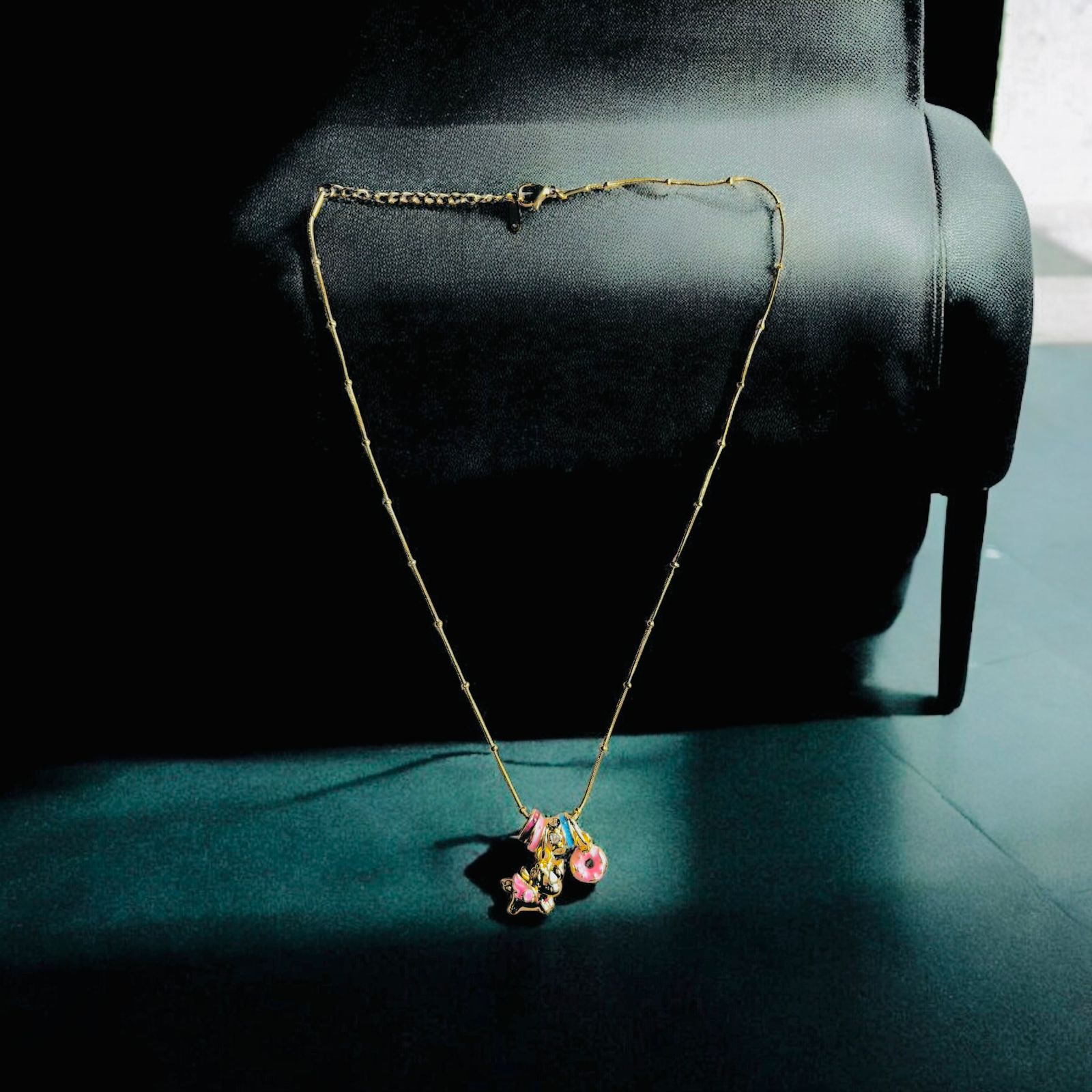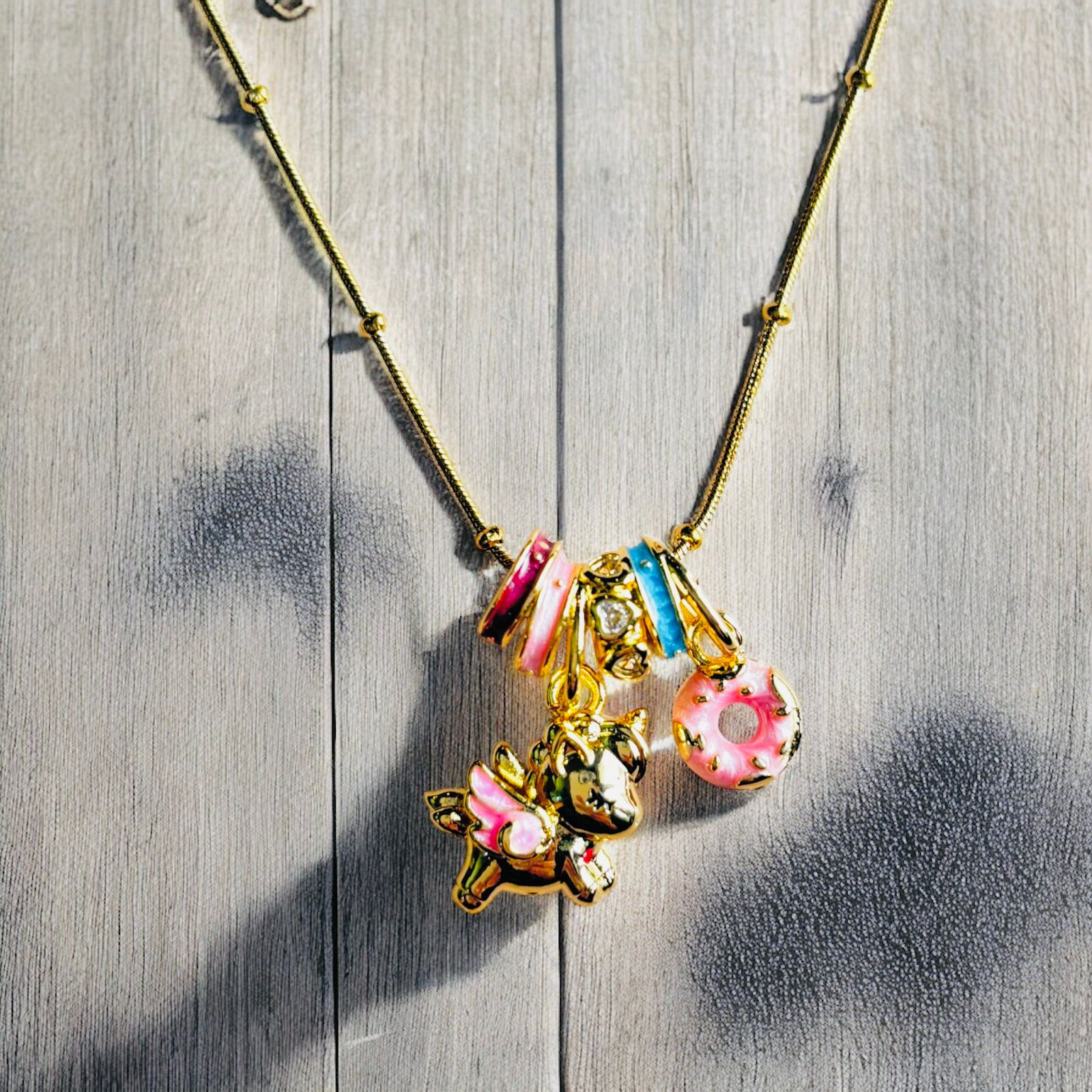 Whimsical, colorful, and full of joy—this charm necklace features a unicorn, donuts, and gem-like beads in pink and blue. Perfect for Gen Z or anyone embracing their playful side.