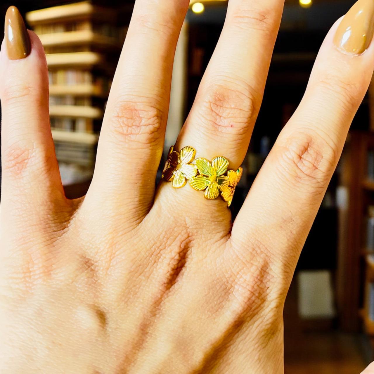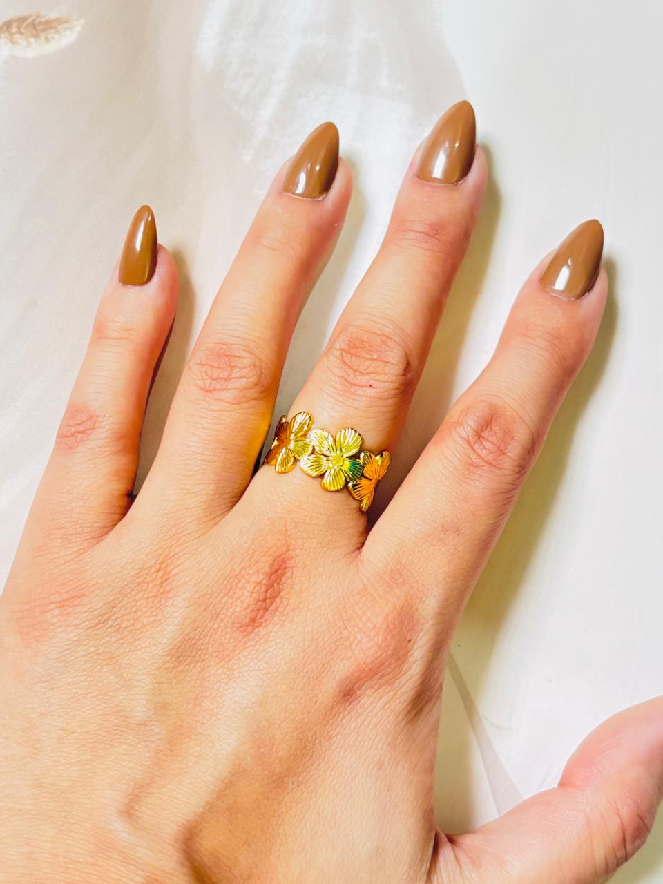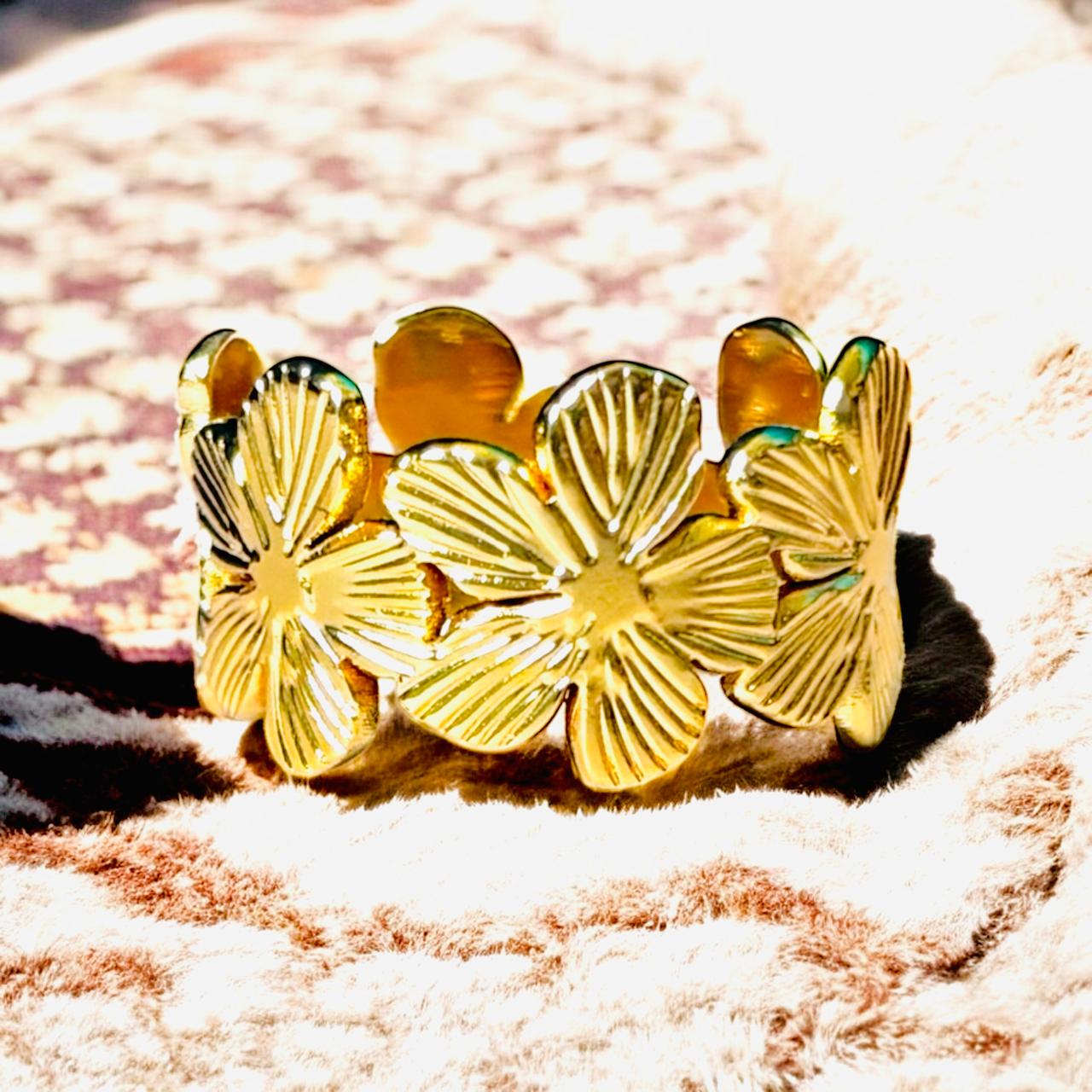 Adorn yourself with floral finesse in our Golden Bloom Ring. Featuring intricately carved blossoms all around, this adjustable piece radiates charm and romance — a forever spring moment captured in anti-tarnish golden brilliance.
