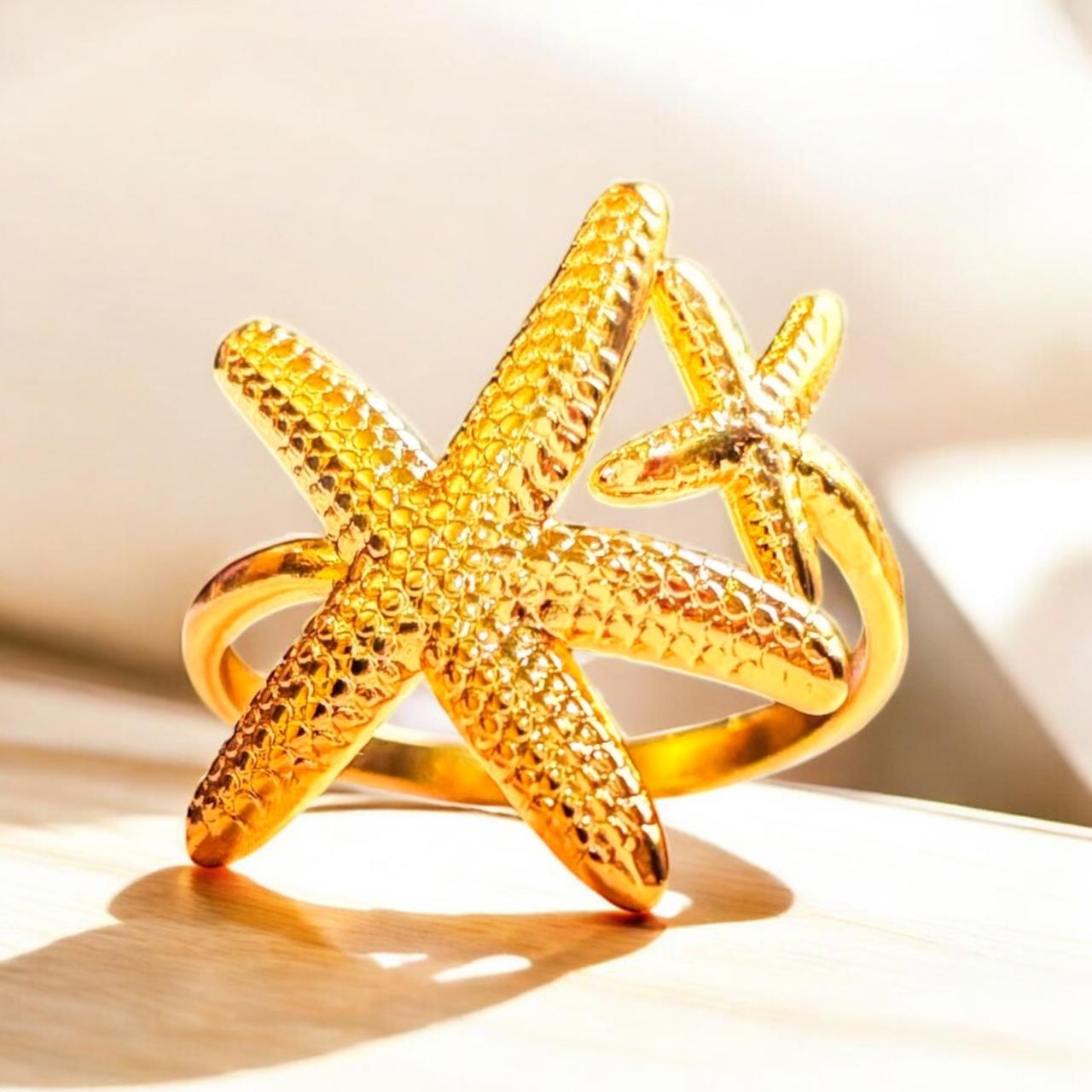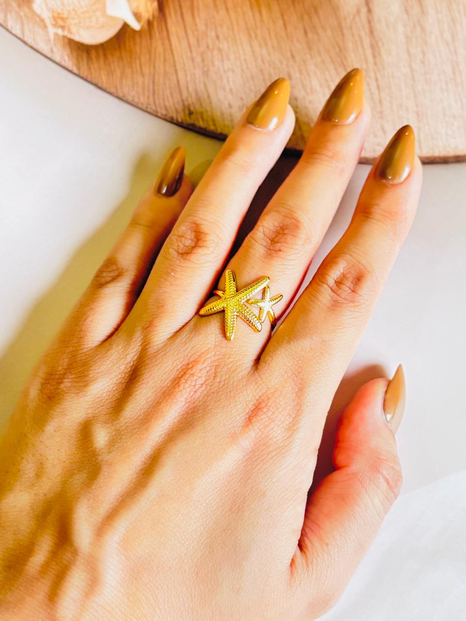 Bring beachy bliss to your fingers with the Golden Star Fish Ring — a playful yet elegant piece inspired by ocean treasures. Finished in a radiant gold tone with anti-tarnish protection, it’s a cute reminder of seaside serenity and sunny days.