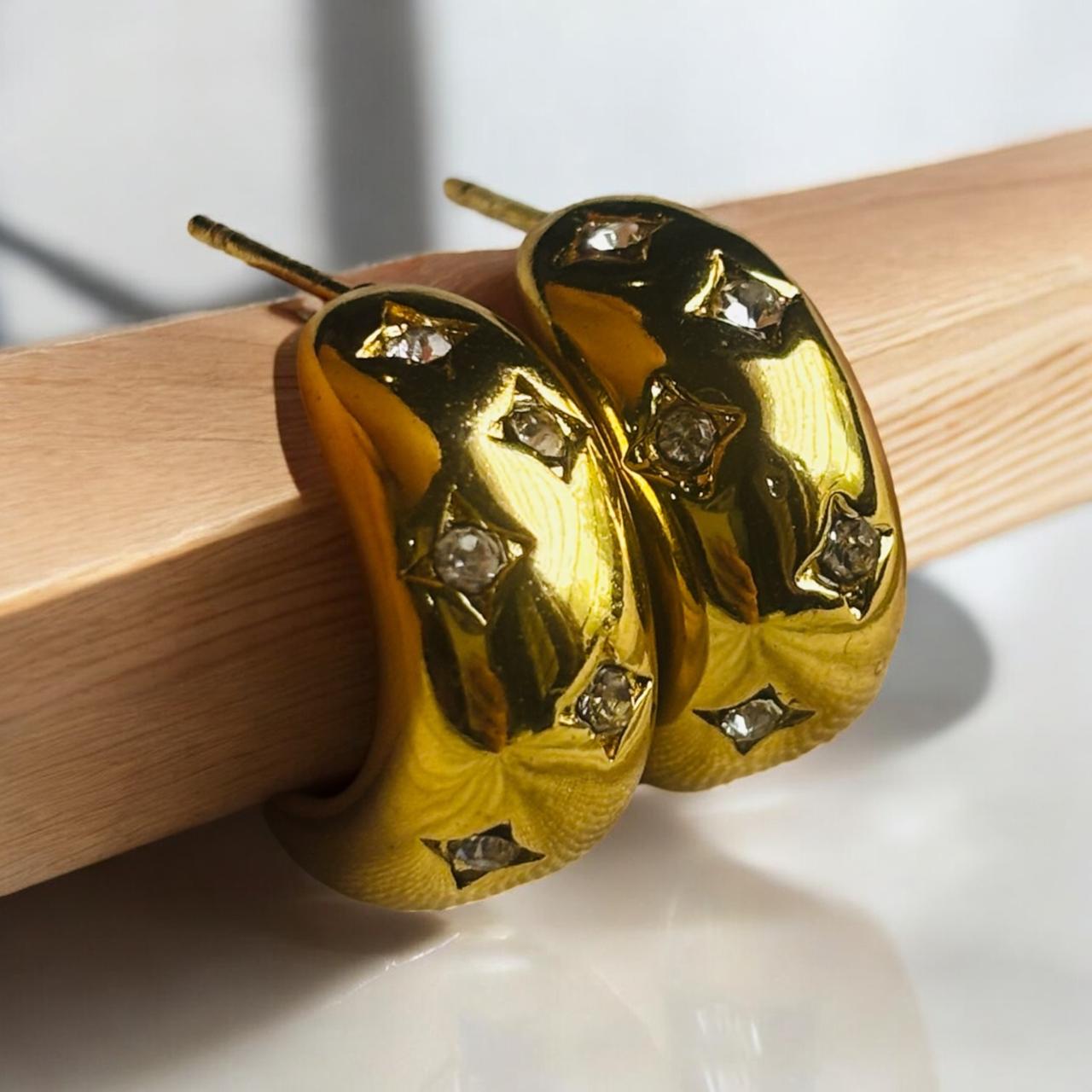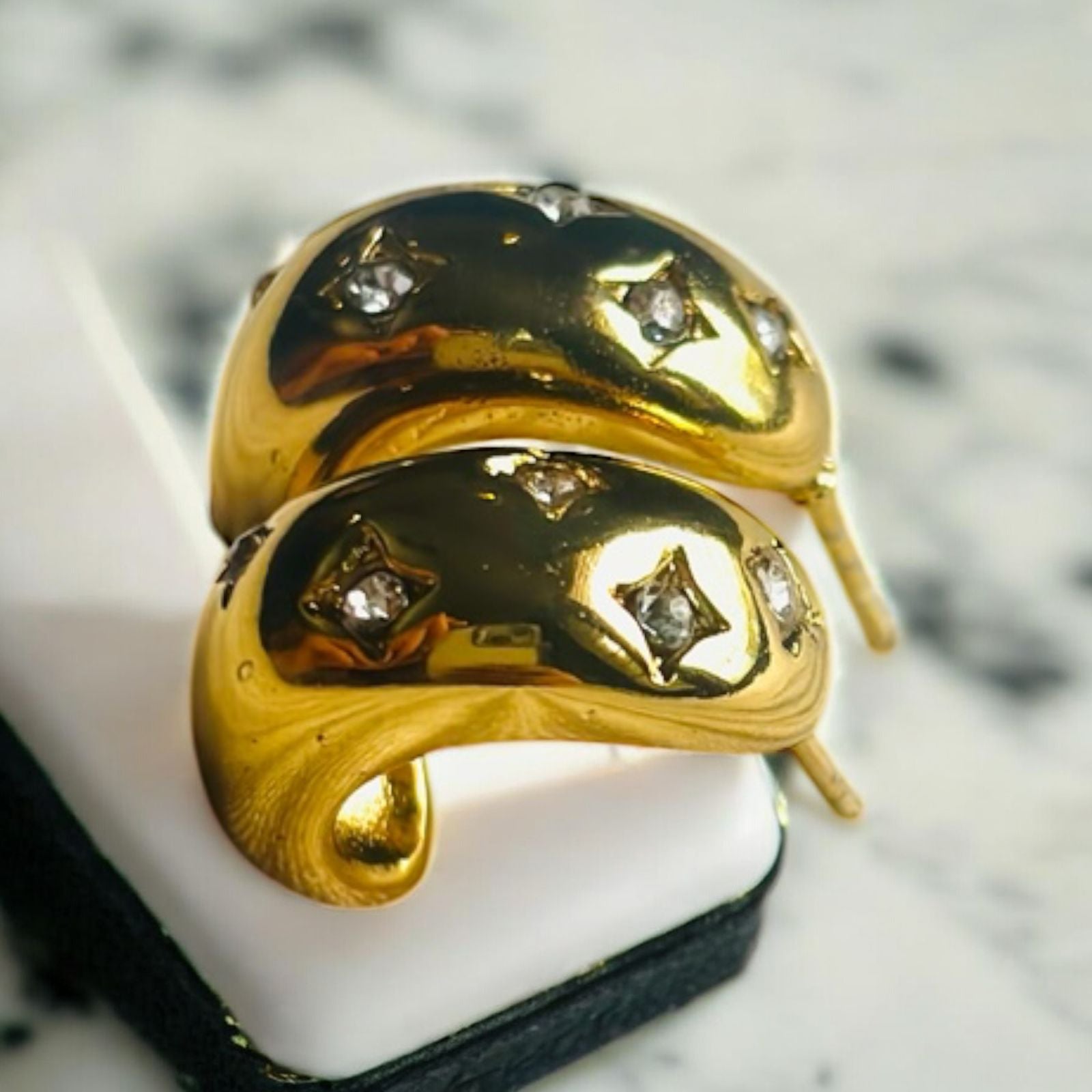 A classic never goes out of style. The Eternal Spark Studs feature brilliant diamond-cut stones set in a minimal gold frame, designed to catch the light with every turn. Whether you're dressing up for an event or adding a touch of elegance to your everyday look, these anti-tarnish, hypoallergenic studs are your forever go-to. Timeless, radiant, and effortlessly graceful.