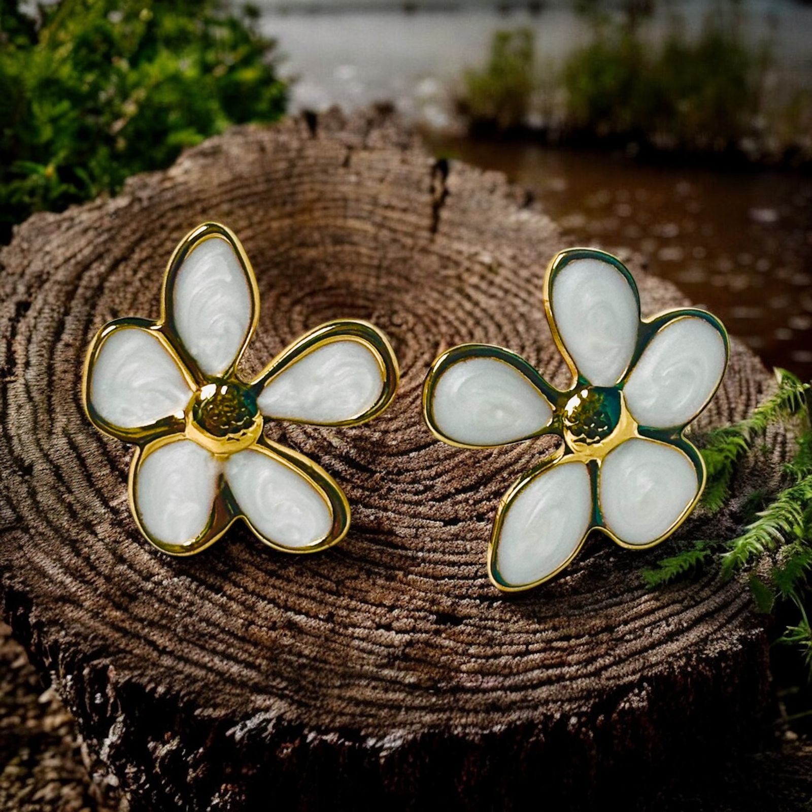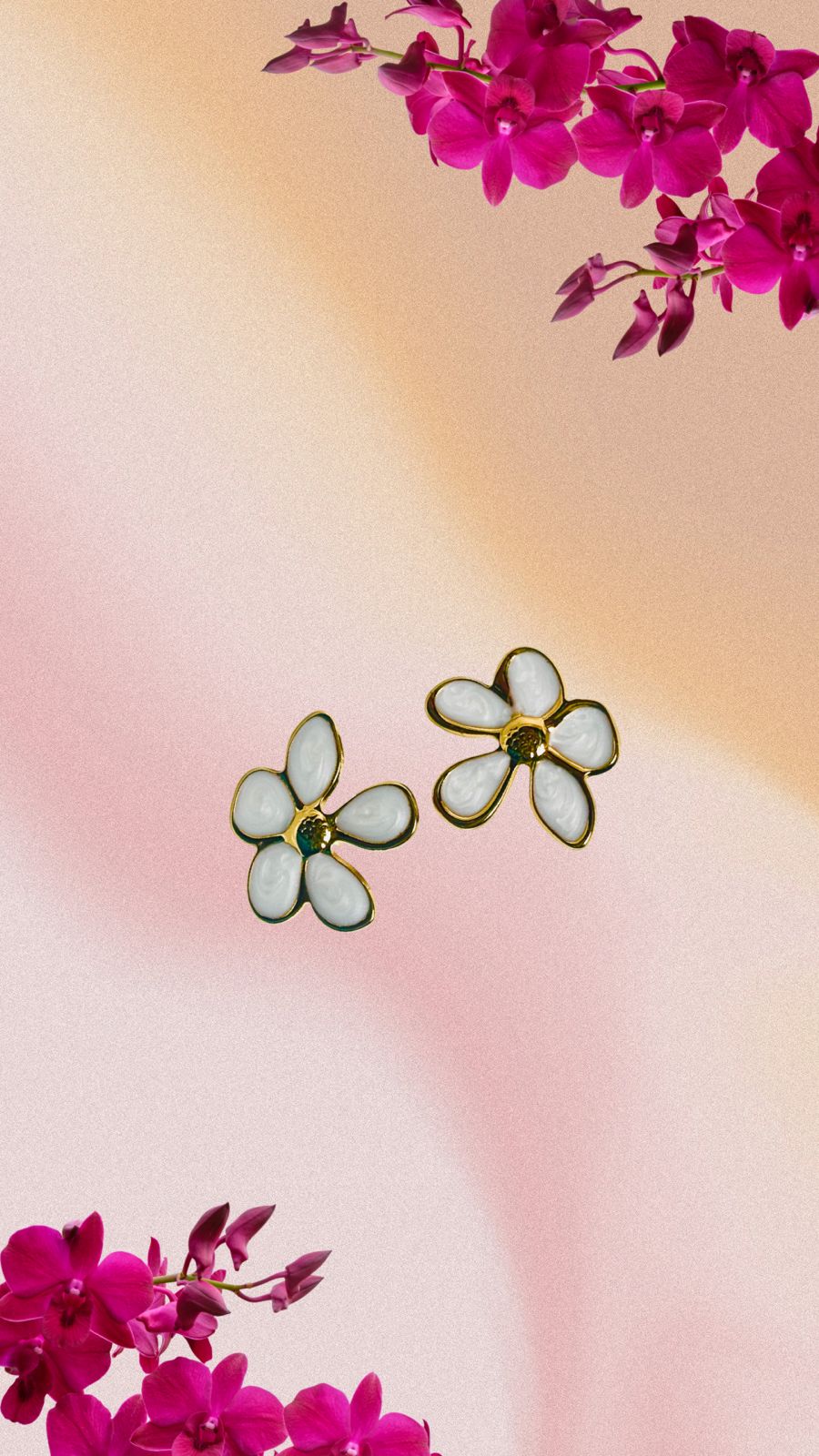 Radiating natural elegance, these five-petal floral earrings feature a soft white marbled enamel framed in gleaming gold. The textured golden center adds a refined touch, making them a versatile accessory for both day and evening wear.