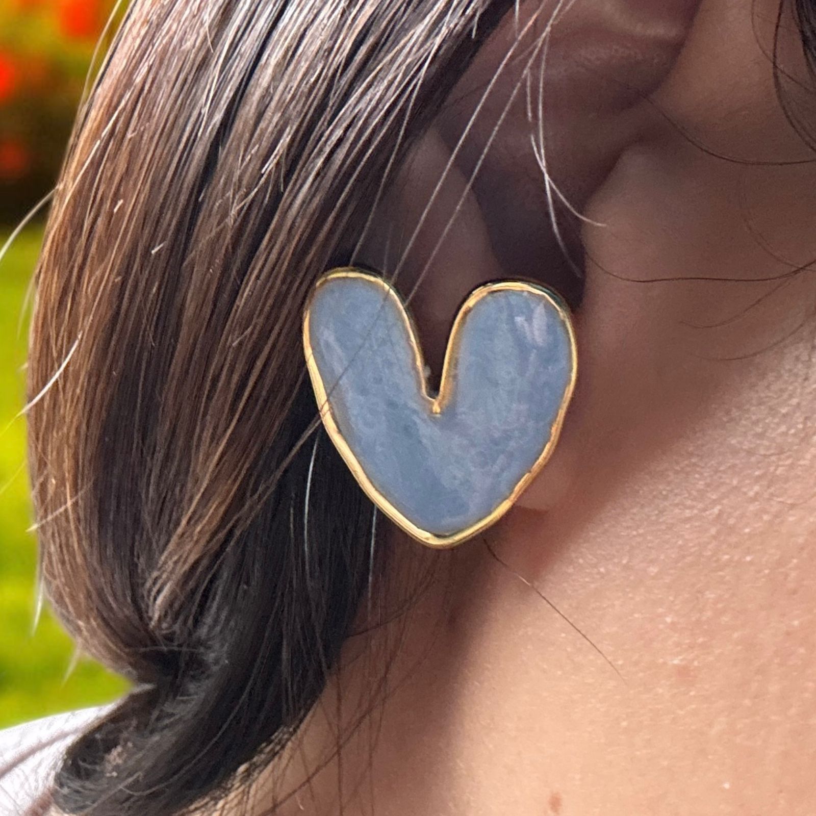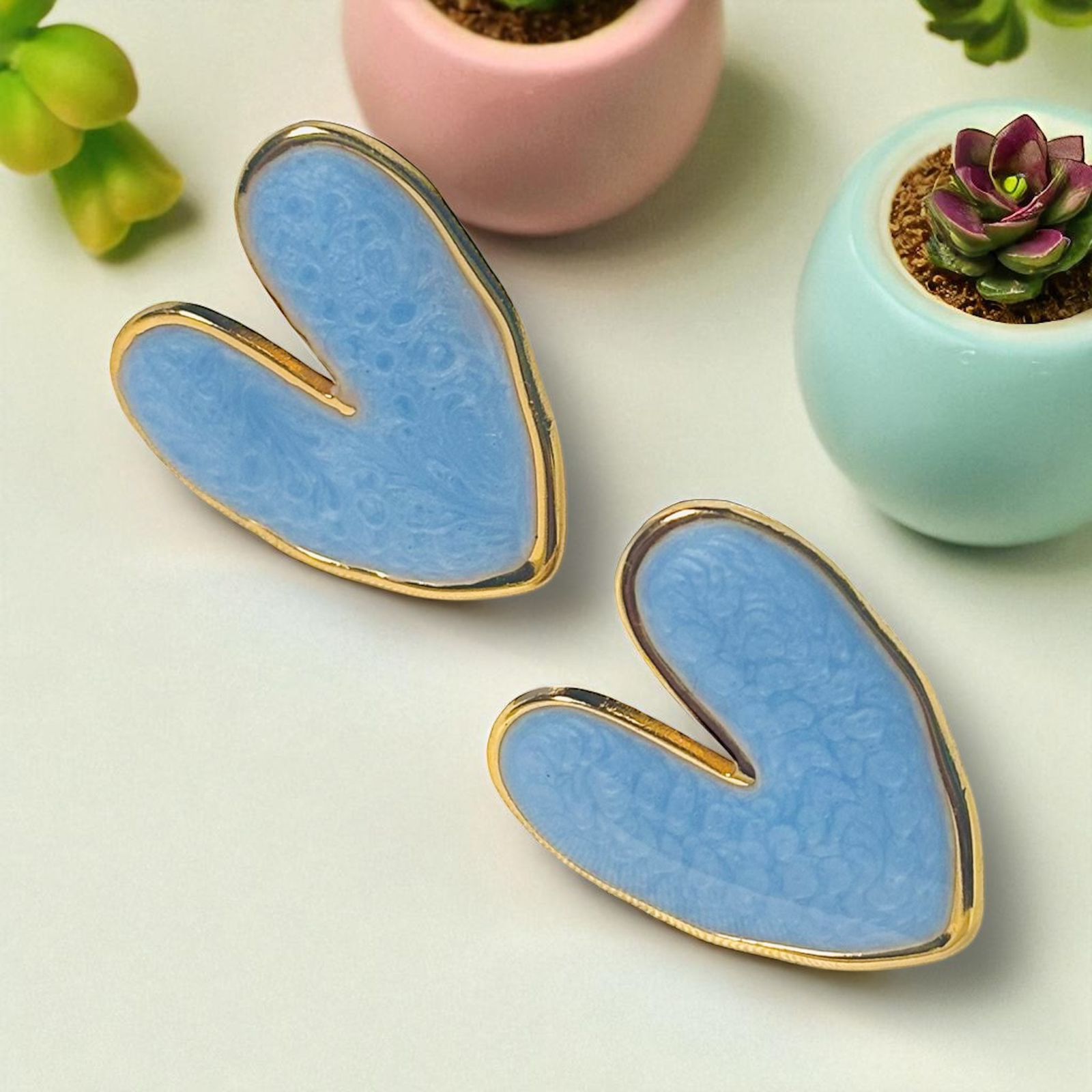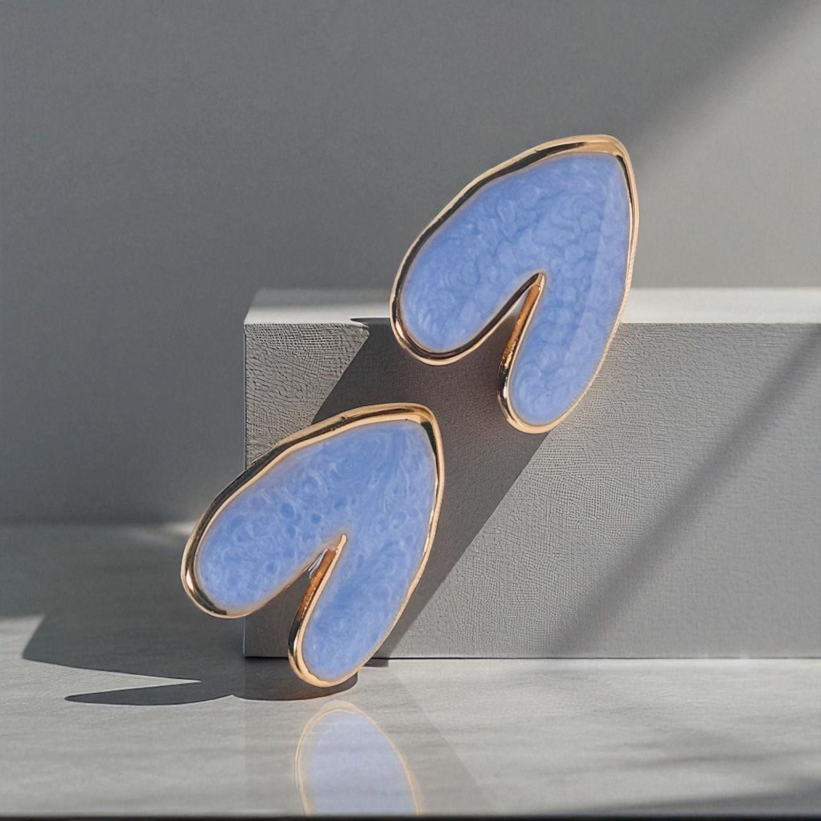 These asymmetrical heart-shaped earrings feature a soft sky-blue enamel with delicate marbled patterns, framed in a sleek golden outline. Their modern, artistic design adds a refreshing pop of color, perfect for elevating both casual and chic outfits.