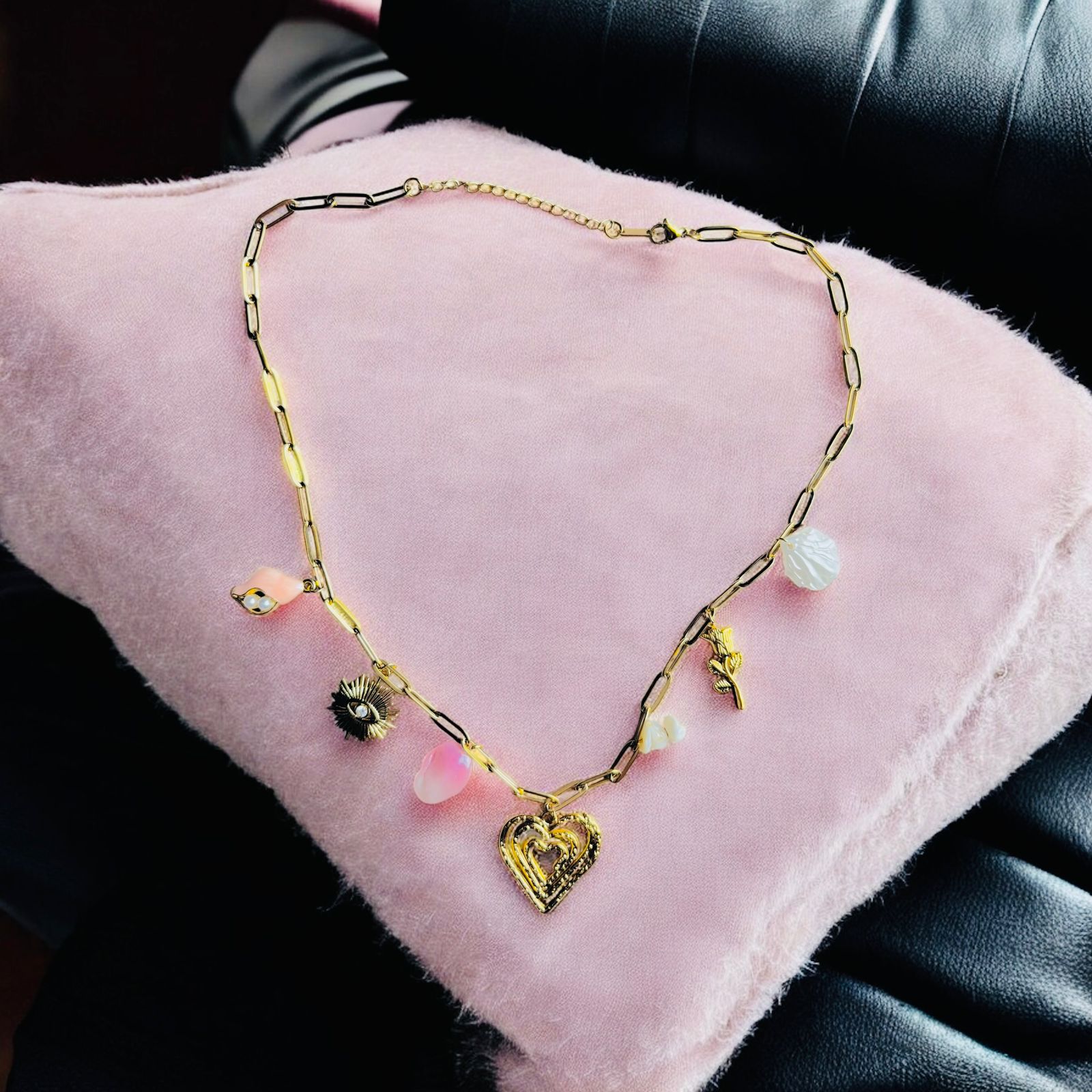 The Love in Bloom Charm Necklace brings together the timeless symbols of affection—a dainty heart, a delicate flower, and a sparkling charm—each suspended on a lustrous anti-tarnish chain. Lightweight, hypoallergenic, and sweatproof, this necklace is perfect for adding a soft, romantic touch to your everyday look.