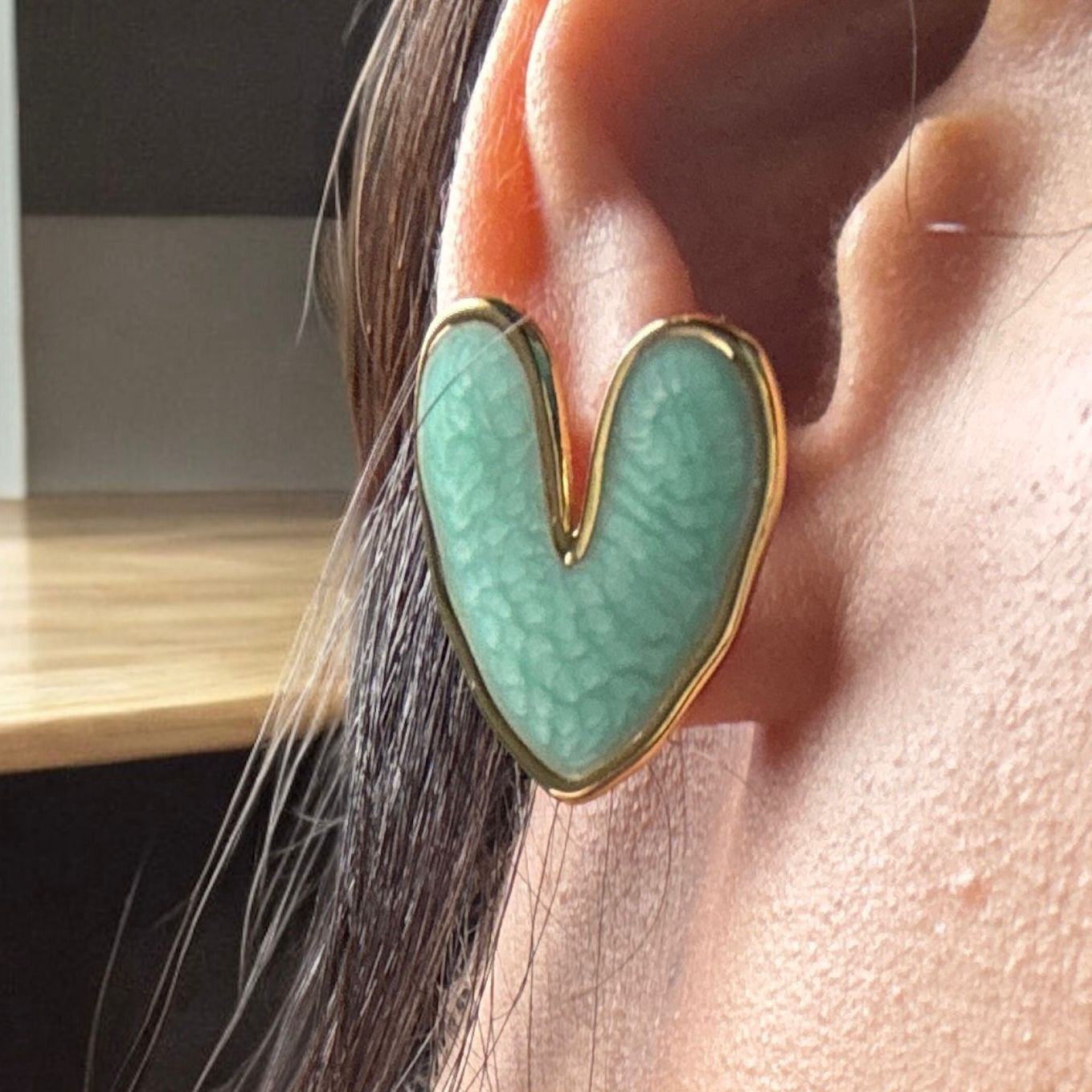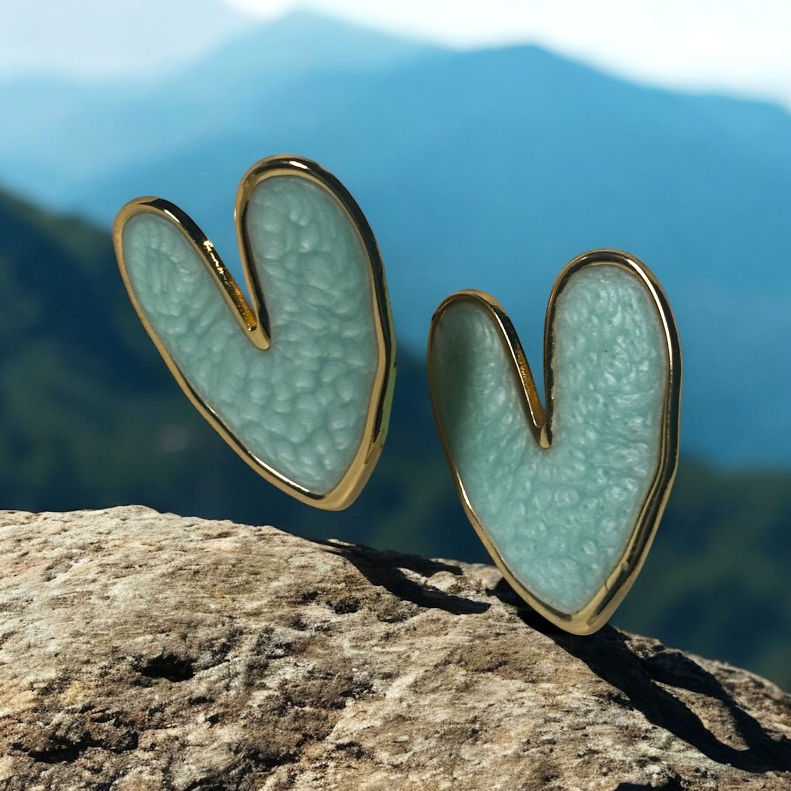 Elegant and modern, these asymmetrical heart-shaped earrings showcase a textured mint-green enamel framed in a sleek golden border. Their fresh, minimalist charm makes them a versatile accessory for everyday wear or a subtle pop of color in your chic ensembles.