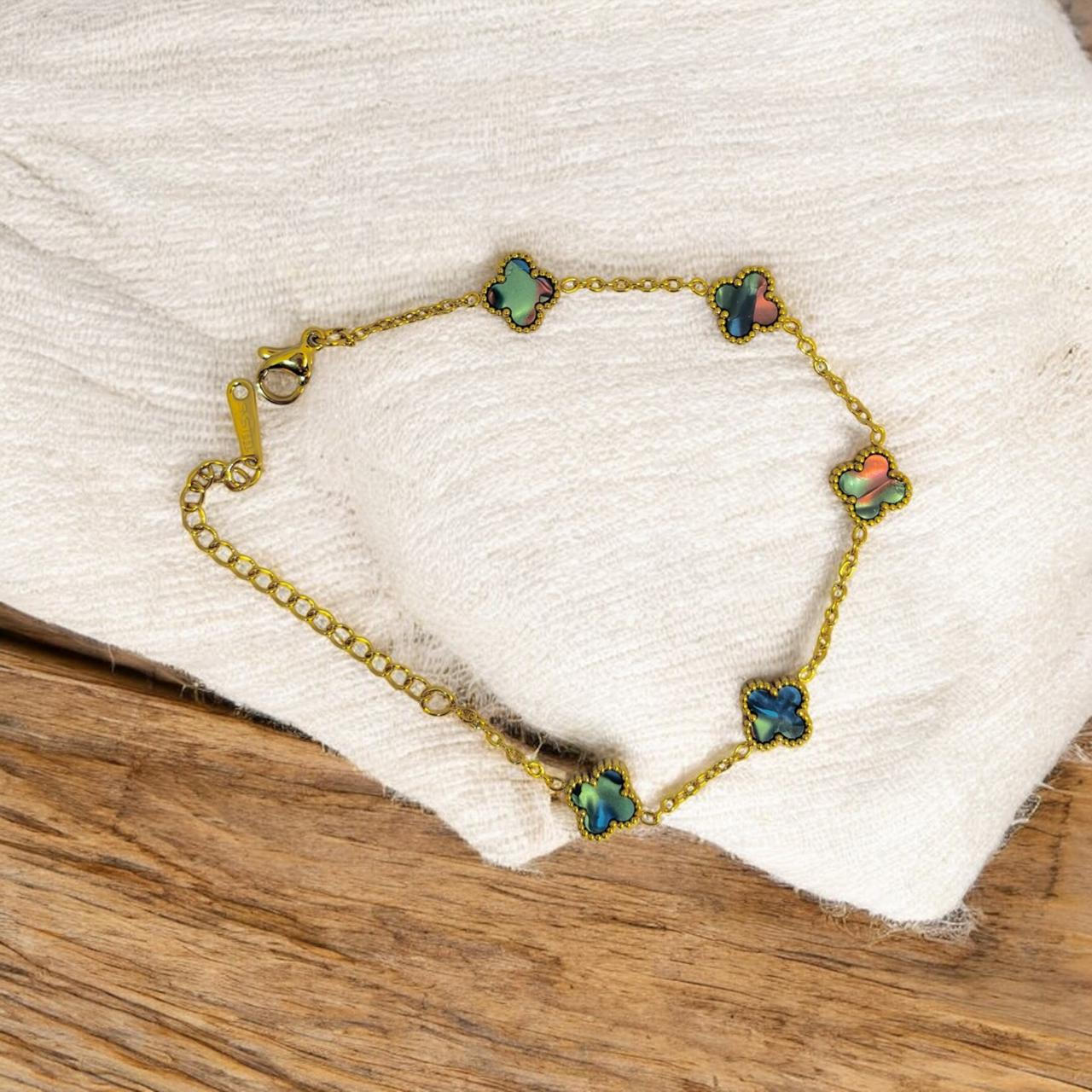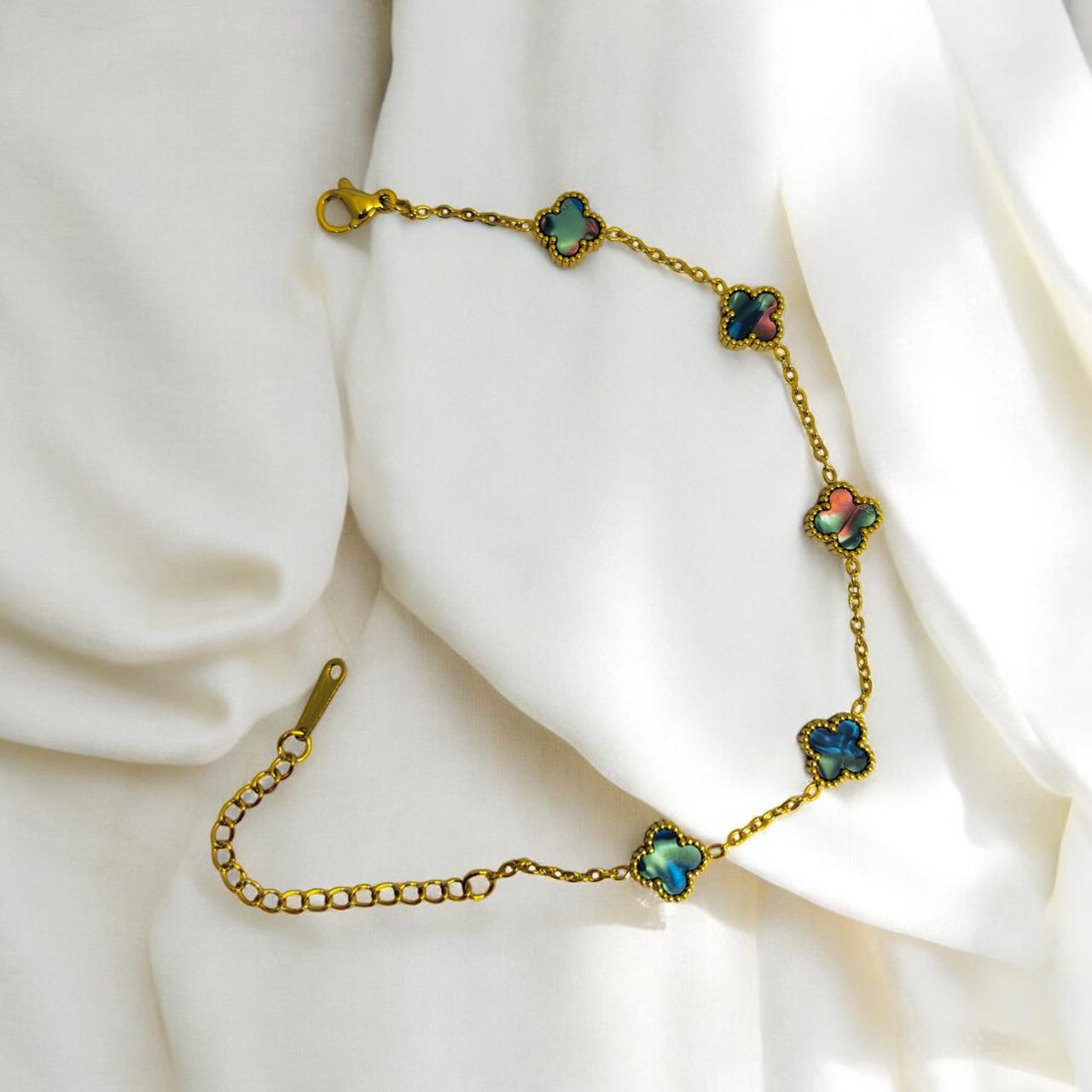 Add a pop of elegance with our Mystique Clover Bracelet, featuring multicoloured clover charms set in a dainty gold-toned chain. The vibrant hues reflect beautifully under light, giving each clover a magical, iridescent look. Perfect for both daily wear and layering with other pieces.