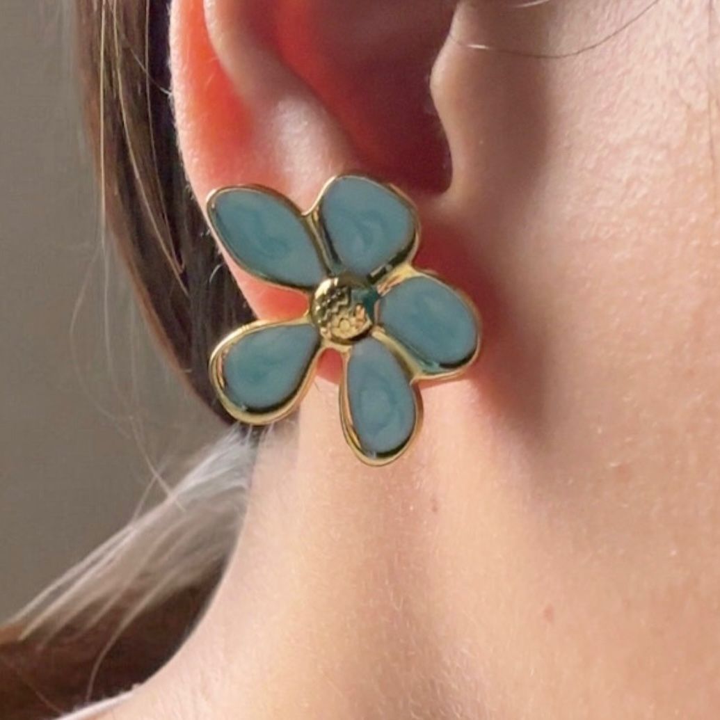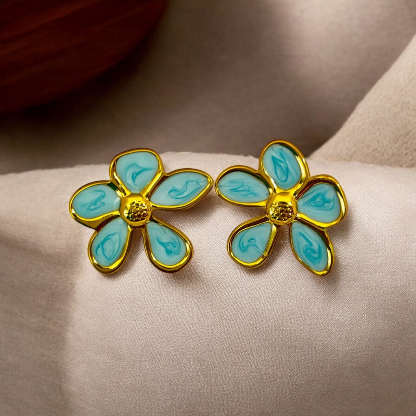 Delicate charm meets everyday elegance with our Bloom Studs-featuring soft bluish green petals framed in golden edges. These floral enamel earrings bring a fresh, feminine tiuch to your look.
